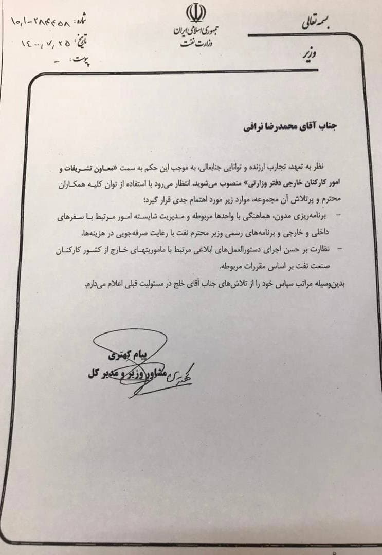 پیام کهتری، مشاور وزیر نفت با صدور حکمی محمدرضا نراقی را بهعنوان معاون تشریفات و امور کارکنان خارجی دفتر وزارتی منصوب کرد.