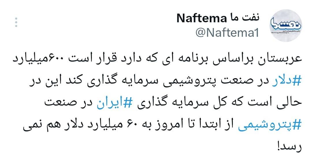 نفت ما در شبکه "ایکس" نوشت؛‏عربستان براساس برنامه ای که دارد قرار است ۶۰۰میلیارد ‎دلار در صنعت پتروشیمی سرمایه گذاری کند این در حالی است که کل سرمایه گذاری ‎ایران در صنعت ‎پتروشیمی از ابتدا تا امروز به ۶۰ میلیارد دلار هم نمی رسد!