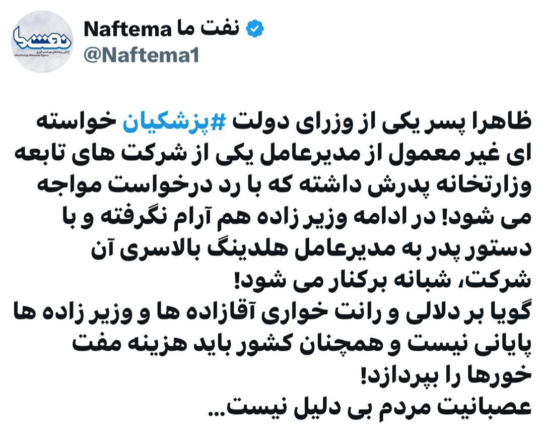 ‏گویا بر دلالی و رانت خواری آقازاده ها و وزیر زاده ها پایانی نیست و همچنان کشور باید هزینه مفت خورها را بپردازد!
