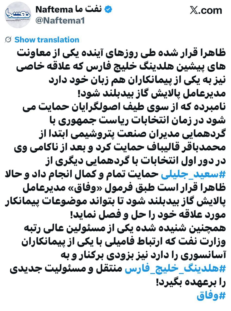 ظاهرا قرار شده طی روزهای آینده یکی از معاونت های پیشین هلدینگ خلیج فارس که علاقه خاصی نیز به یکی از پیمانکاران هم زبان خود دارد مدیرعامل پالایش گاز بیدبلند شود!