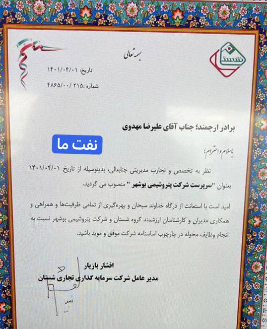 نفت ما"، گفته می شود مهدوی رییس هیات مدیره این شرکت به عنوان سرپرست جدید شرکت پتروشیمی بوشهر معرفی شد.