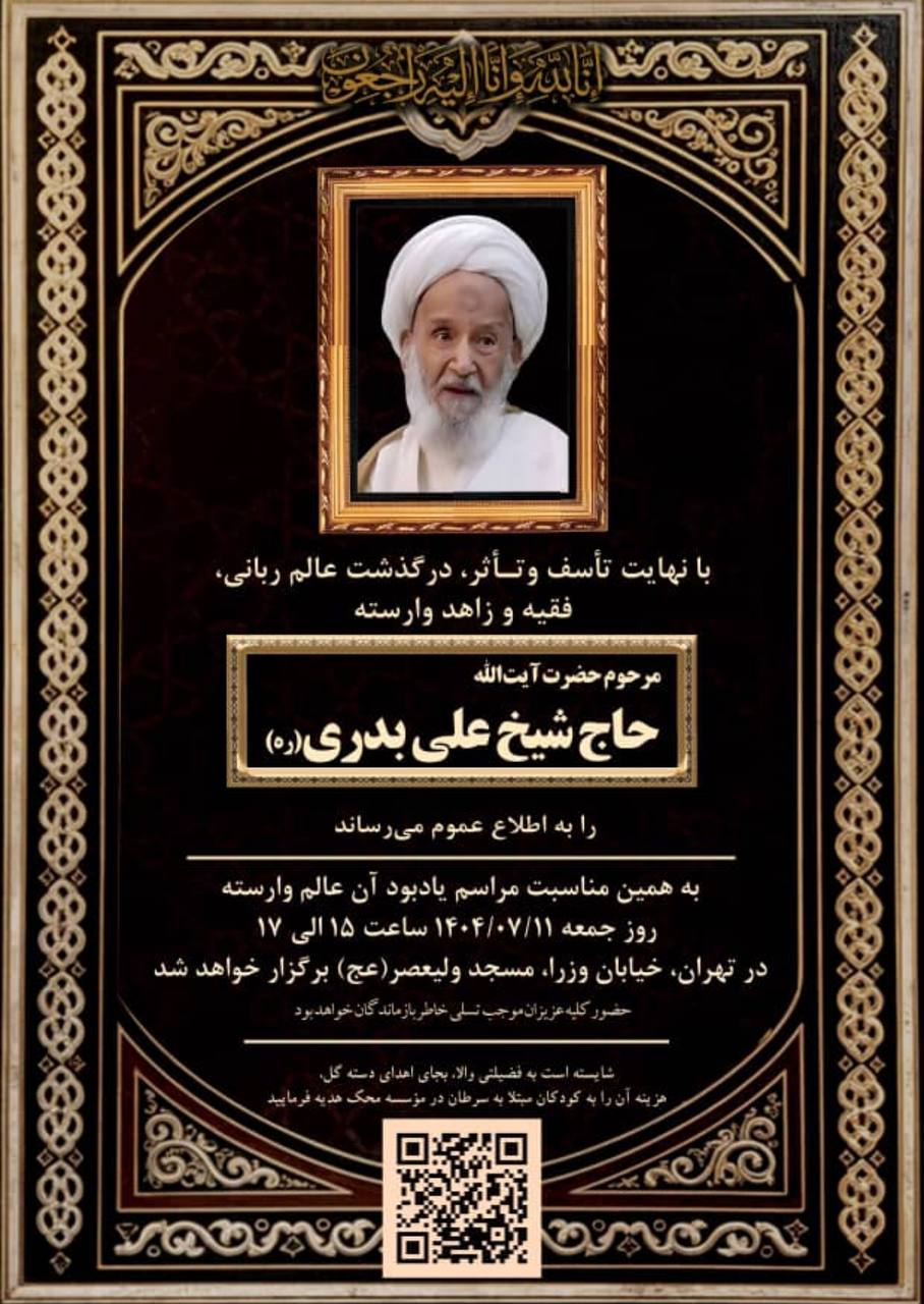 به گزارش آژانس رویدادهای مهم نفت و انرژی "نفت ما"،مراسم یادبود حاج شیخ علی بدری ابوی جواد بدری مدیرعامل پتروشیمی بوعلی سینا در تهران مشخص شد.
