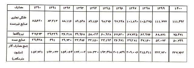 در جدول زیر میزان گاز مصرفی در بخشهای مختلف ارائه شده است. جهت فهم بهتر اینکه این میزان به چه صورت در طول سالهای اخیر افزوده شده است، روند آماری ۱۰ ساله ذکر میشود. میزان رشد گاز مورد نیاز نیز در این آمارها موجود است (اعداد به میلیون مترمکعب در سال است برای مثال در کل سال ۱۳۹۹ بالغ بر ۲۳۲ میلیارد و ۷۲۰ میلیون مترمکعب گاز در بخشهای مختلف کشور مصرف شده است).