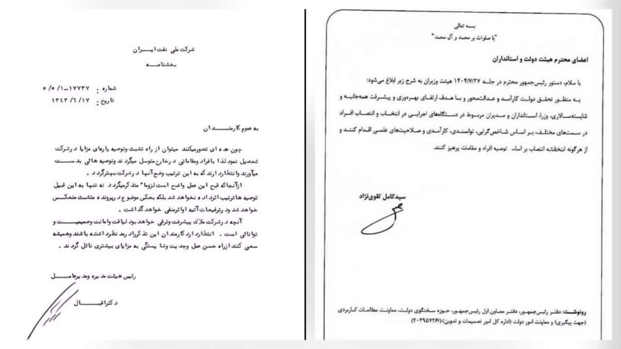 به گزارش آژانس رویدادهای مهم نفت و انرژی "نفت ما"، ۶۰ سال پس از آنکه دکتر اقبال مدیرعامل شرکت ملی نفت ایران طی بخشنامه‌ای به کارمندان این شرکت اعلام کرد «به هرگونه توصیه‌نامه برای ترفیع، ترتیب اثر داده نخواهد شد» و «آنچه در شرکت، ملاک پیشرفت و ترقی خواهد بود لیاقت و امانت و صمیمیت و توانایی است» دولت مسعود پزشکیان ابلاغیه جدیدی مبنی بر «پرهیز از هرگونه انتخاب و انتصاب بر اساس توصیه افراد و مقامات» صادر کرده است تا نشان دهد پس از شش دهه، این مشکل عمیق‌تر از گذشته است!